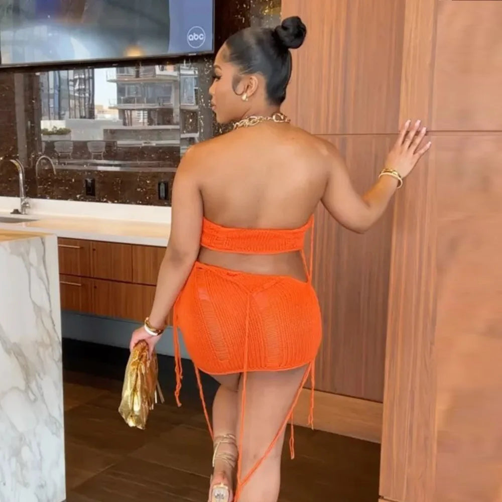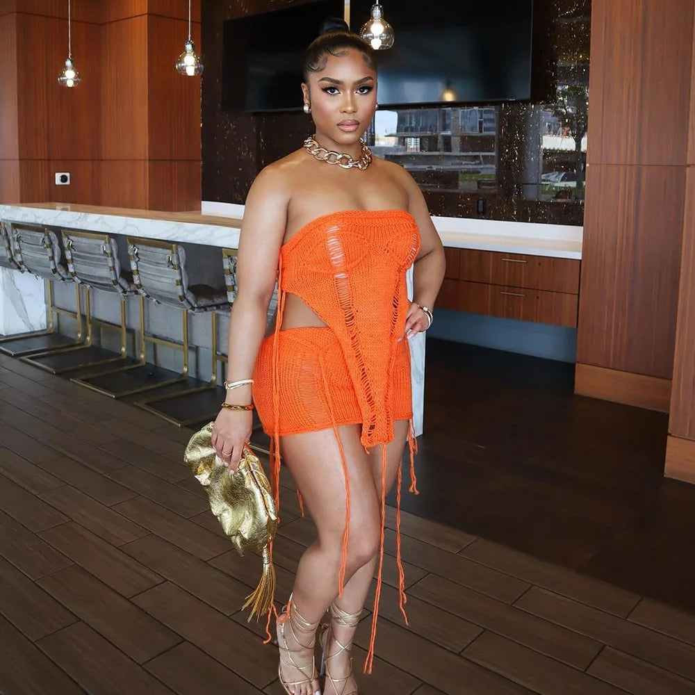 Irregular Knitted Strapless Crop Top & Mini Skirt Sets