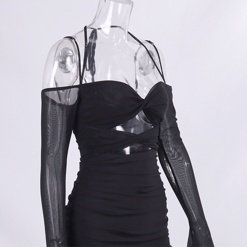 Mesh Sleeve Hollow Ruched Mini Dresses