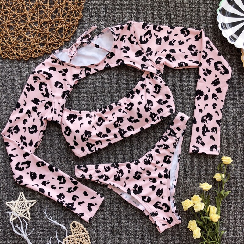 Neon Leopard Micro Crop Long Sleeve 3 Pcs Bikini Sets