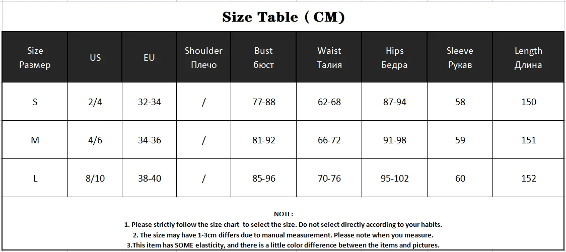 | Size (cm) | Bust | Waist | Hip | Sleeve Length | Length |